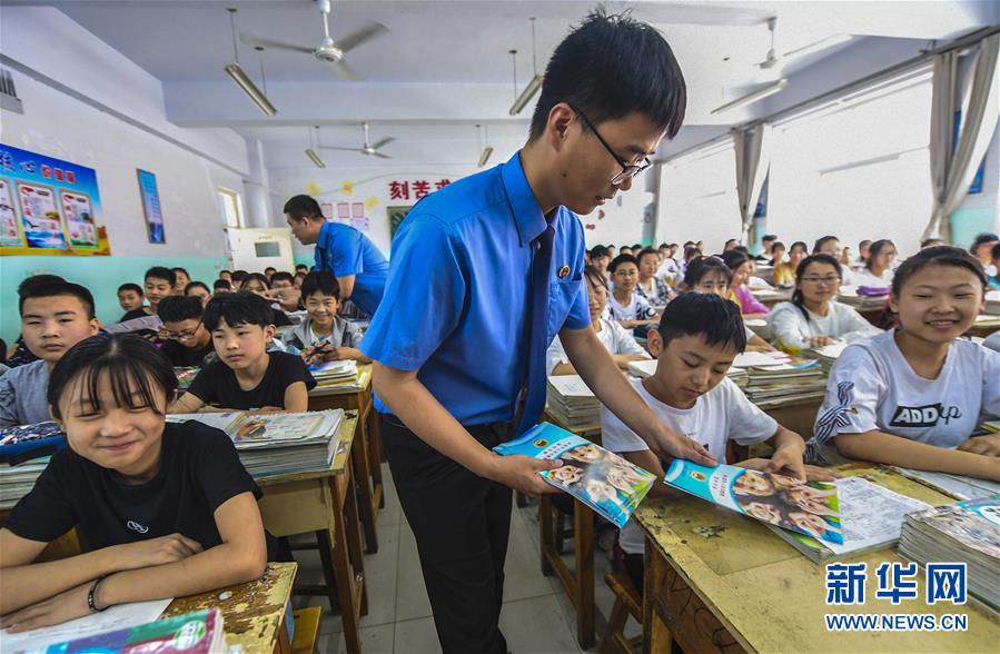 5月24日,在河北省故城县运河中学,故城县人民检察院工作人员向学生们发放未成年人法治教育宣传手册。 近年来,河北省故城县高度重视青少年法治宣传教育工作,支持鼓励学校开展多种形式的法治教育,着力打造未成年人法治教育基地,促进未成年人健康成长。 新华社记者李晓果摄