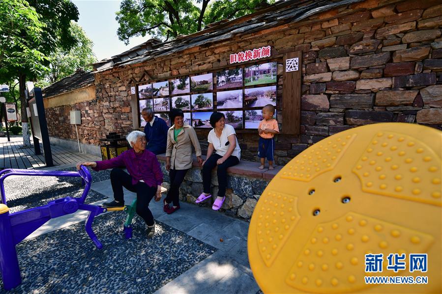 5月23日,庙荒村村民在村里的健身广场休息。 背靠太行山的河南省林州市黄华镇庙荒村,如同它的名字一般,耕地少、荒坡多,曾经是有名的贫困村。近年来,庙荒村在积极改善农村基础设施的同时,充分利用一山(太行山)一水(红旗渠)资源,大力发展乡村旅游产业,带动村民脱贫增收。村里成立了旅游公司,通过政府引导与政策激励,鼓励农户发展农家乐、民宿。2018年底,庙荒村顺利脱贫。 新华社记者冯大鹏摄