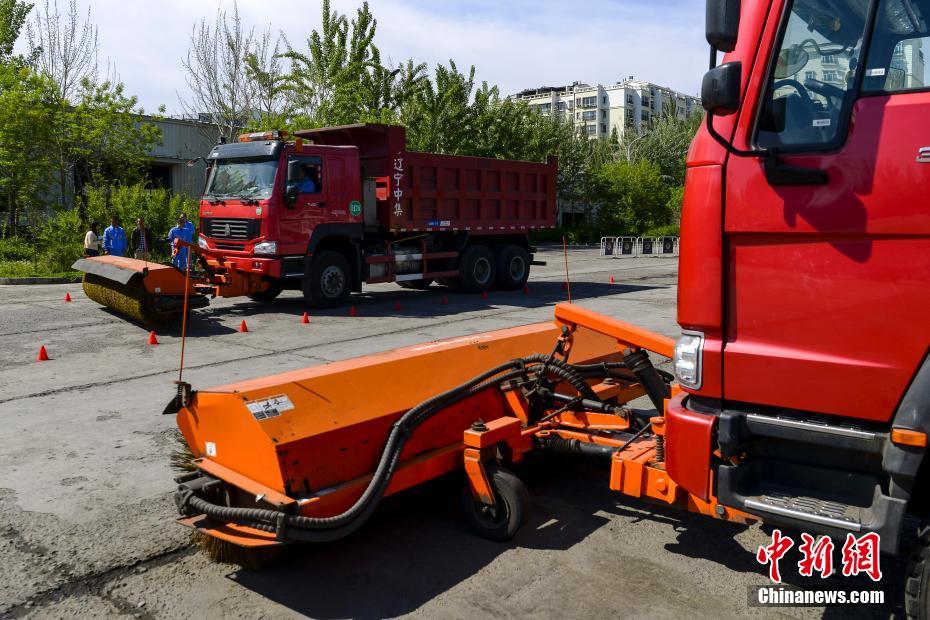 5月24日,新疆乌鲁木齐市水磨沟区环卫清运队作业基地,一场特种车辆技能大赛在此进行,150名环卫工人参加角逐。此次比赛分为业务知识竞赛和特种车辆技能比赛两个部分,下设11个比赛项目,重点围绕清扫车、洒水车、垃圾清运车等环卫特种车辆的定点停车、定点清洗、故障排除等方面进行比赛。图为清雪车定位赛现场,环卫工人驾驶大型清雪车快速通过。中新社记者 刘新 摄