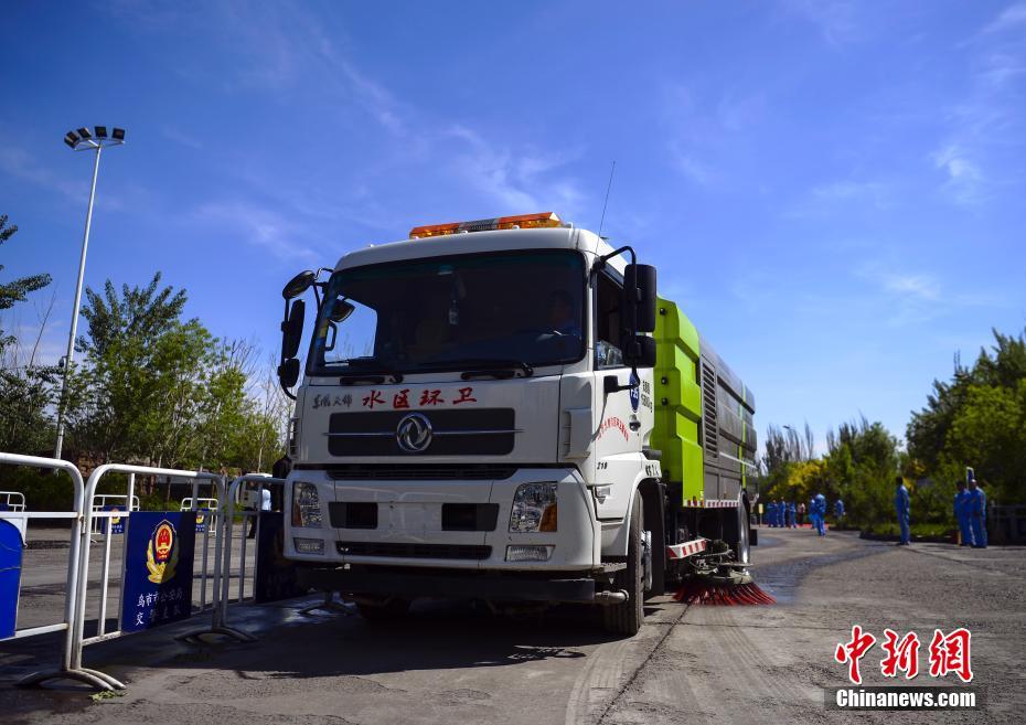 5月24日,新疆乌鲁木齐市水磨沟区环卫清运队作业基地,一场特种车辆技能大赛在此进行,150名环卫工人参加角逐。此次比赛分为业务知识竞赛和特种车辆技能比赛两个部分,下设11个比赛项目,重点围绕清扫车、洒水车、垃圾清运车等环卫特种车辆的定点停车、定点清洗、故障排除等方面进行比赛。图为清扫车直线清扫比赛现场,环卫工人驾驶清扫车沿既定路线清扫路面及护栏下垃圾。中新社记者 刘新 摄
