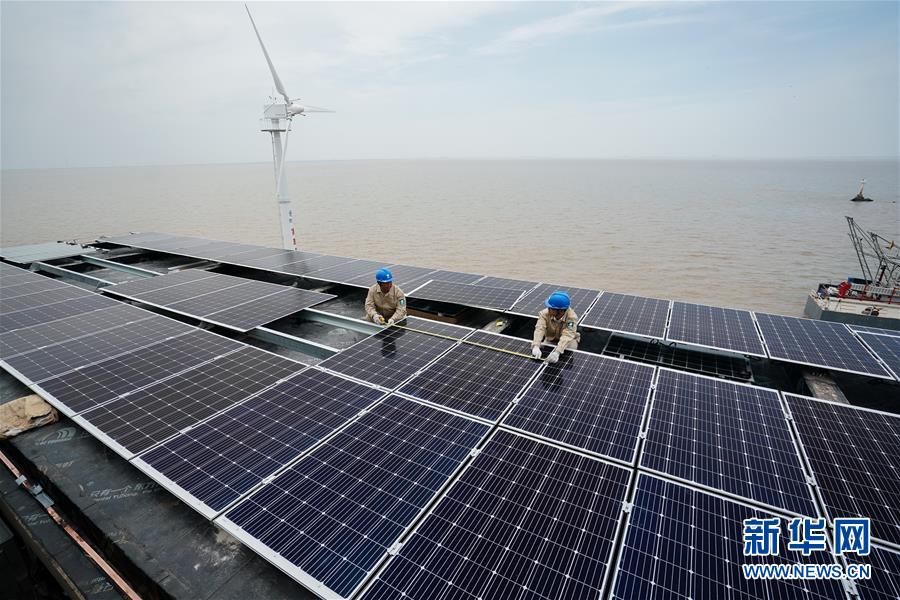 5月24日,工作人员在开山岛房屋顶上铺设光伏面板。
