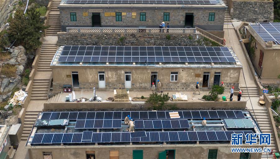 这是5月24日无人机拍摄的开山岛,工作人员在屋顶铺设光伏面板。