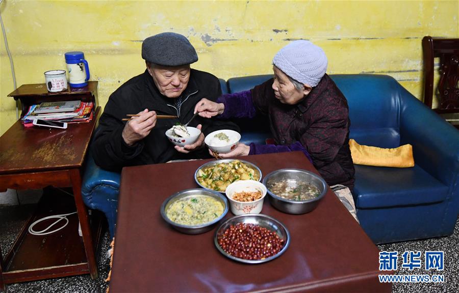 张富清和老伴在家吃晚饭(3月31日摄)。新华社记者 程敏 摄