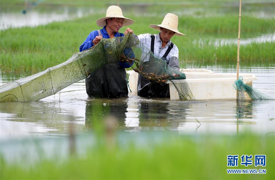 在江西省南昌市南昌县广福镇沙港村,当地农户在小龙虾养殖基地内捕捞(5月24日摄)。 近年来,江西省南昌市南昌县支持鼓励当地农户发展小龙虾养殖,在莲藕田和水稻田等传统作物种植区施放小龙虾苗,进行共养。目前,南昌县小龙虾特色养殖基地6000余亩,年产小龙虾近700吨,为当地农户开辟一条致富之路。 新华社记者 彭昭之 摄