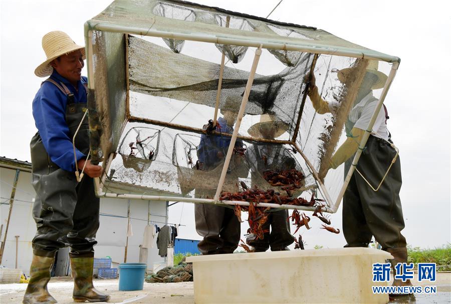 在江西省南昌市南昌县广福镇沙港村,当地农户将刚捕获的小龙虾装筐准备外销(5月24日摄)。 近年来,江西省南昌市南昌县支持鼓励当地农户发展小龙虾养殖,在莲藕田和水稻田等传统作物种植区施放小龙虾苗,进行共养。目前南昌县小龙虾特色养殖基地6000余亩,年产小龙虾近700吨,为当地农户开辟一条致富之路。 新华社记者 彭昭之 摄