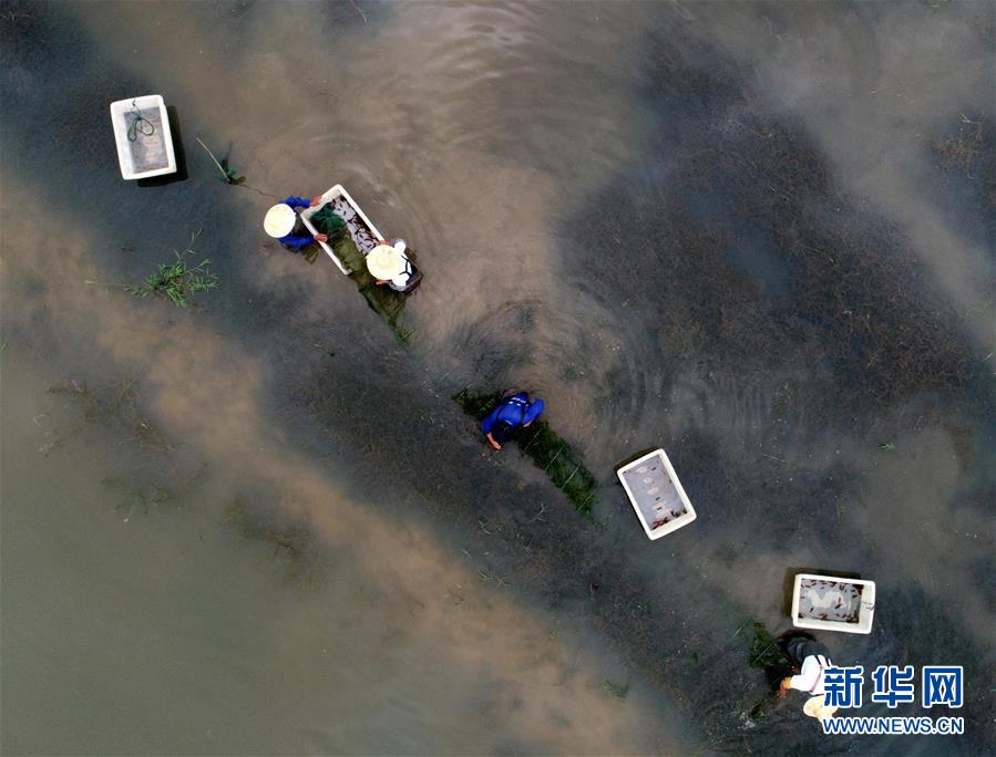 在江西省南昌市南昌县广福镇沙港村,当地农户在小龙虾养殖基地内捕捞(5月24日无人机拍摄)。 近年来,江西省南昌市南昌县支持鼓励当地农户发展小龙虾养殖,在莲藕田和水稻田等传统作物种植区施放小龙虾苗,进行共养。目前南昌县小龙虾特色养殖基地6000余亩,年产小龙虾近700吨,为当地农户开辟一条致富之路。 新华社记者 彭昭之 摄