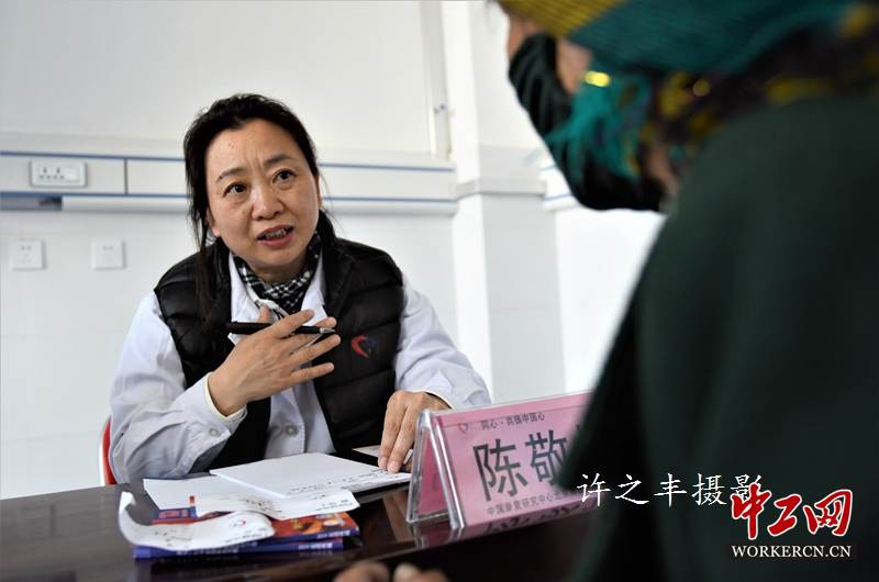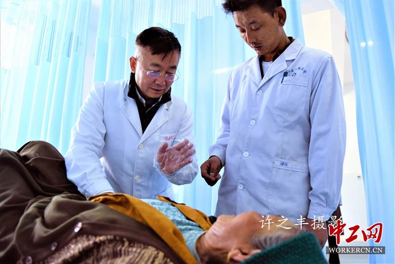 2019年5月27日,“同心·共铸中国心”走进西藏的12名医疗专家和志愿者红十团红三连,在连长王俊生的率领下,来到曲水县人民医院为当地百姓看病治疗。曲水县管辖1个镇、5个乡,17个行政村,总人口29690人。这里平均海拔3650米,医疗专家们克服高原等不良反应,全天义诊451名患者。早上六点,在曲水县人民医院门口,前来看病的患者就已经排起长队等待义诊。工人日报-中工网许之丰摄影报道