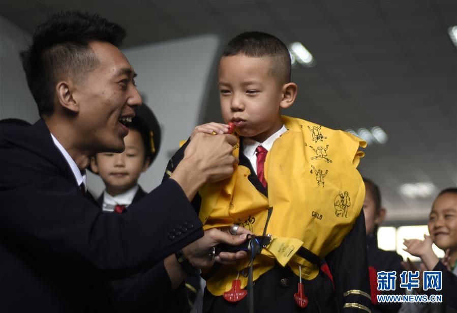 5月27日,在兰州文理学院航空模拟训练舱,空乘人员引导小朋友体验救生衣使用方法。