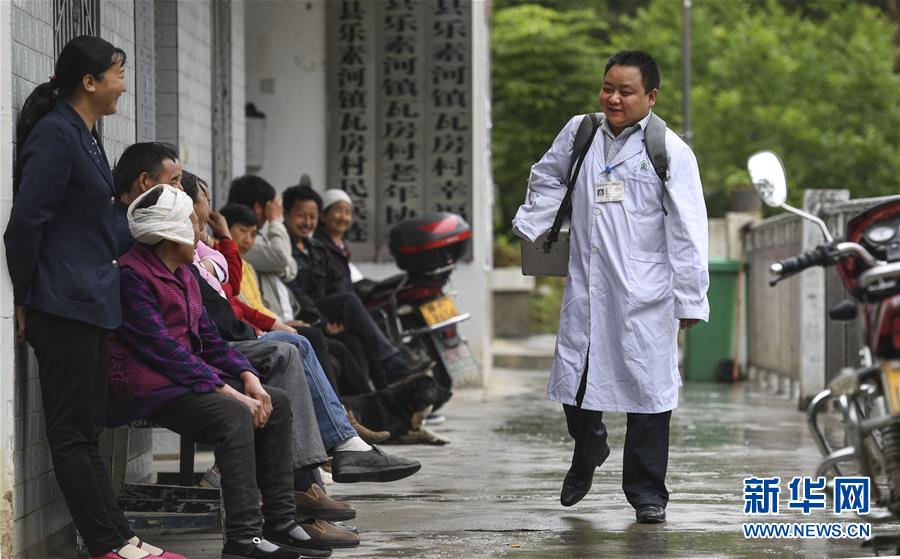 5月28日,何永清(右)一大早出门“送医上门”后回到村卫生室时,门口排满了等待就诊的村民。