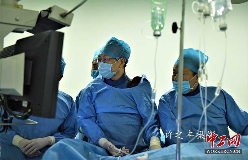 2019年5月28日上午,西藏军区总医院手术室,“同心·共铸中国心”走进西藏,来自首都医科大学附属北京安贞医院心脏内科中心主任马长生教授为首的专家团队经过会诊后,在主刀医师陈岩教授率领下,经过五十六分钟的手术治疗,成功完成为患者进行的心内科手术。图为陈岩教授在西藏军区总医院心内科配合下的手术现场。工人日报-中工网许之丰摄影报道