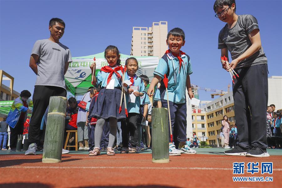 5月28日,在河北省遵化市第六实验小学,学生在进行投壶游戏。 新华社发(刘满仓 摄)