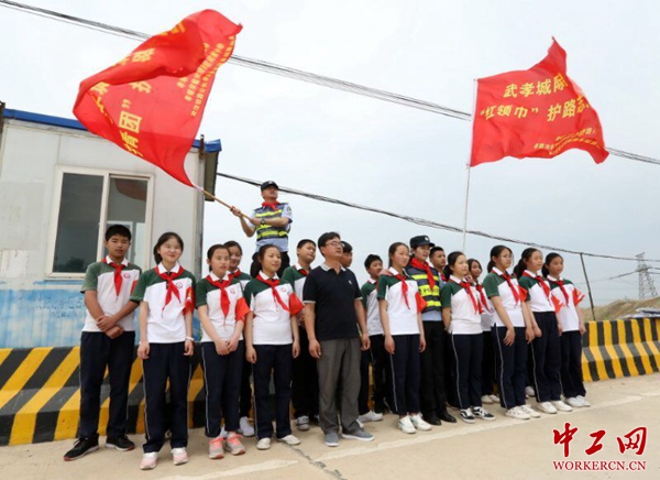 29日,武汉铁警带领武孝城际铁路“红领巾(共青团)”护路志愿队义务巡查武孝城际铁路,开展爱路护路宣传活动,庆祝“六一儿童节”。