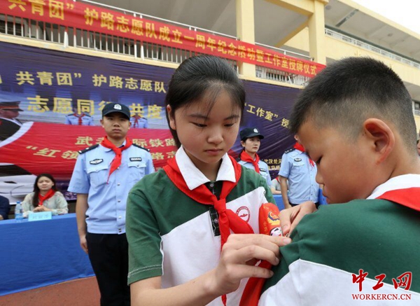 29日,湖北省孝感市闵集学校的武孝城际铁路“红领巾(共青团)”护路志愿队老队员为新队员戴袖标。