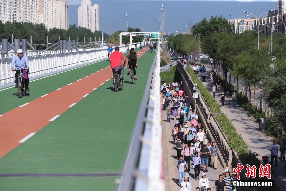 5月31日,北京首条自行车专用道开通试运行。自行车专用道为全封闭设计,全长6.5公里,东起昌平区回龙观,西至海淀区后厂村路,共设置8个出入口,骑行时速不超15公里,禁止行人、电动自行车及其他车辆进入。开通后,将直接服务于沿线约1.16万通勤人口,有效缓解地铁13号线回龙观与上地区域的交通压力,改善区域绿色出行环境。图为高架上的自行车专用道。中新社记者 贾天勇 摄