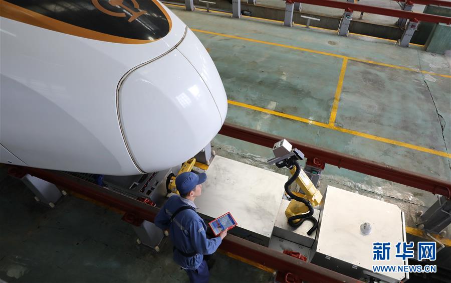 5月31日,动车组机械师使用平板电脑收集检测机器人采集到的检测数据。 当日,动车组检测机器人在上海动车段上海虹桥动车运用所投入使用。这套系统可全自动检测所有型号动车组车底和转向架可视部件,具备数据无线传输以及故障自动判断功能。目前,中国铁路上海局集团有限公司配属动车组近700标准组,越来越多的人工智能技术在动车组检修领域运用,将极大提升检修效率。 新华社记者 方喆 摄