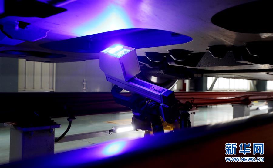 5月31日,动车组检测机器人进行列车检修。 当日,动车组检测机器人在上海动车段上海虹桥动车运用所投入使用。这套系统可全自动检测所有型号动车组车底和转向架可视部件,具备数据无线传输以及故障自动判断功能。目前,中国铁路上海局集团有限公司配属动车组近700标准组,越来越多的人工智能技术在动车组检修领域运用,将极大提升检修效率。 新华社记者 方喆 摄