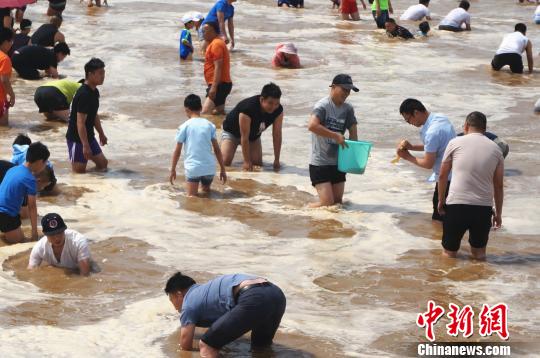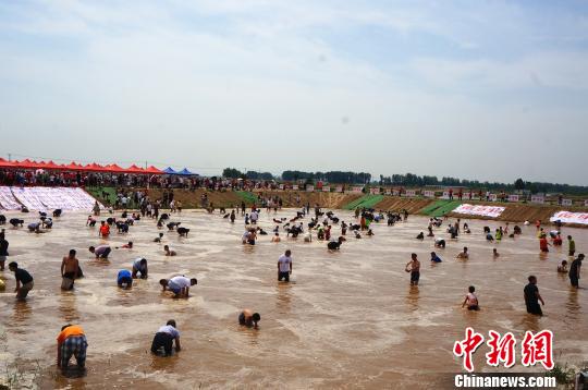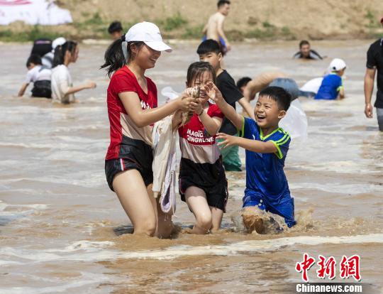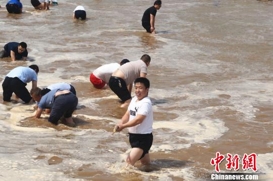 儿童节,郑州千余人黄河滩边上演摸鱼大战。 韩章云 摄