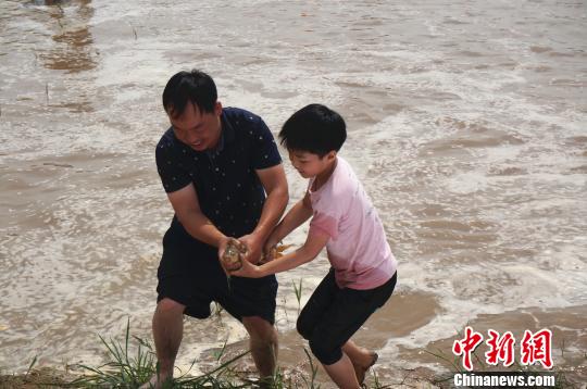 一名小朋友和父亲合作将摸到的大鲤鱼运上岸。 韩章云 摄