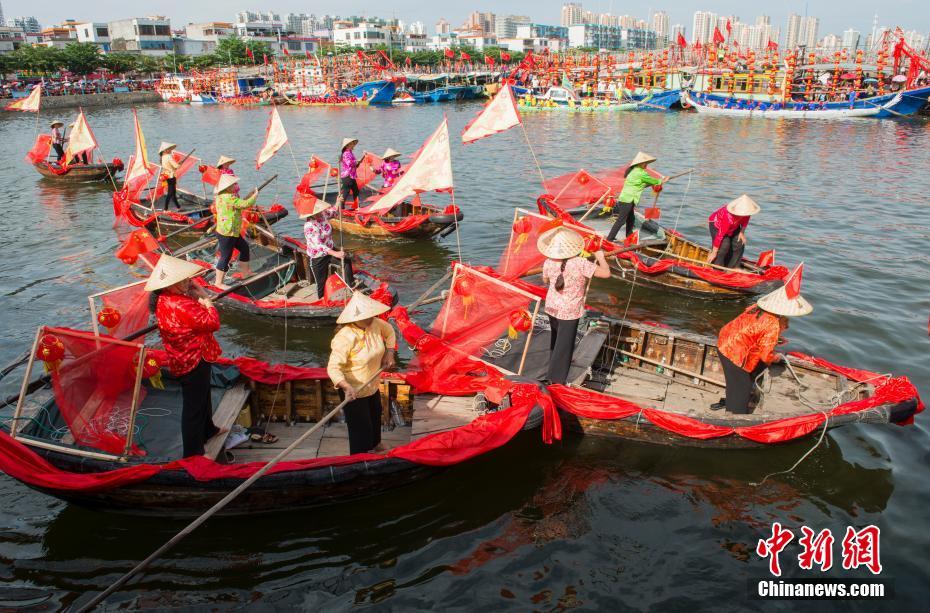 广西北海举行疍家婚礼 船队接亲船上拜堂