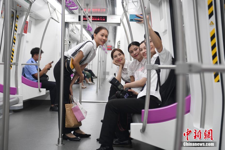 6月6日,广西南宁地铁3号线全线开通试运营。南宁地铁3号线共设23座车站,全长27.9km,率先采用海绵设计概念,增设下凹式绿地、透水铺装等措施渗透,收集场地内雨水,成为全国首个地铁“海绵车辆段”。图为民众在车厢内合影。中新社记者 俞靖 摄