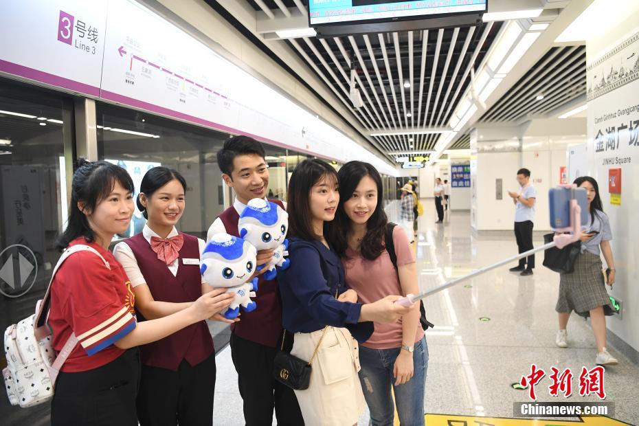 6月6日,广西南宁地铁3号线全线开通试运营。南宁地铁3号线共设23座车站,全长27.9km,率先采用海绵设计概念,增设下凹式绿地、透水铺装等措施渗透,收集场地内雨水,成为全国首个地铁“海绵车辆段”。图为民众与站务员合影。中新社记者 俞靖 摄