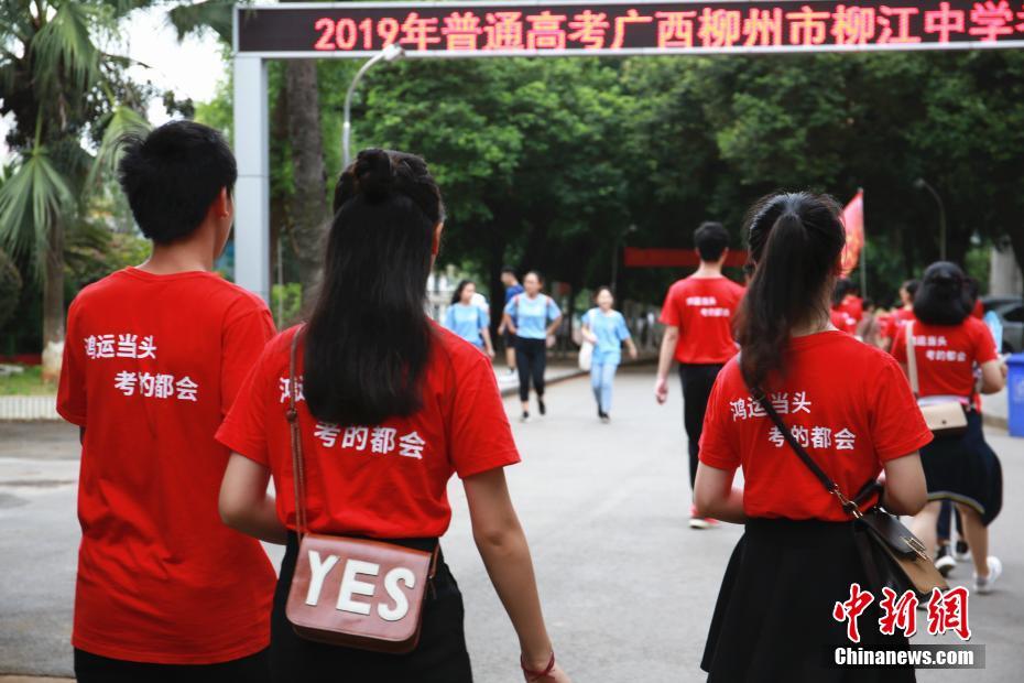 6月7日,2019年高考启幕。在广西柳州市柳江中学考点,考生们头戴红绳、穿着印有“鸿运当头考的都会”字样的衣服、举着“必胜,加油”的牌子,一路唱着歌步入考场,以各式各样的方式为自己鼓劲加油。今年广西高考考生规模达46万,较去年增幅6万余人,总报考人数再创历史新高。图为高考生穿着印有“鸿运当头考的都会”字样的衣服。朱柳融 摄