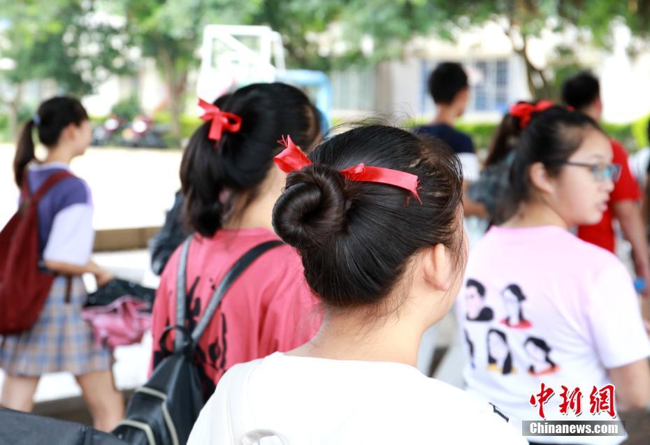 6月7日,2019年高考启幕。在广西柳州市柳江中学考点,考生们头戴红绳、穿着印有“鸿运当头考的都会”字样的衣服、举着“必胜,加油”的牌子,一路唱着歌步入考场,以各式各样的方式为自己鼓劲加油。今年广西高考考生规模达46万,较去年增幅6万余人,总报考人数再创历史新高。图为高考生头上绑着红绳,寓意“鸿运来”。朱柳融 摄
