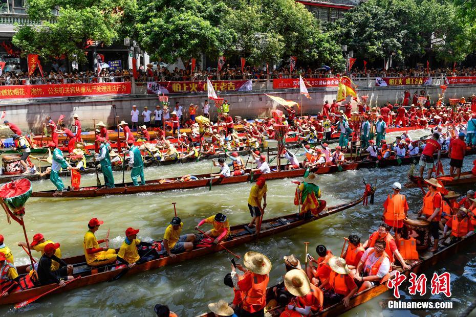 6月7日,各地龙舟会聚广州猎德涌,热闹的场面引民众驻足观看。当日,广州举行端午龙舟胜景活动,来自天河、海珠、番禺等地的各色龙舟会聚猎德涌庆贺端午节。中新社记者 陈骥旻 摄