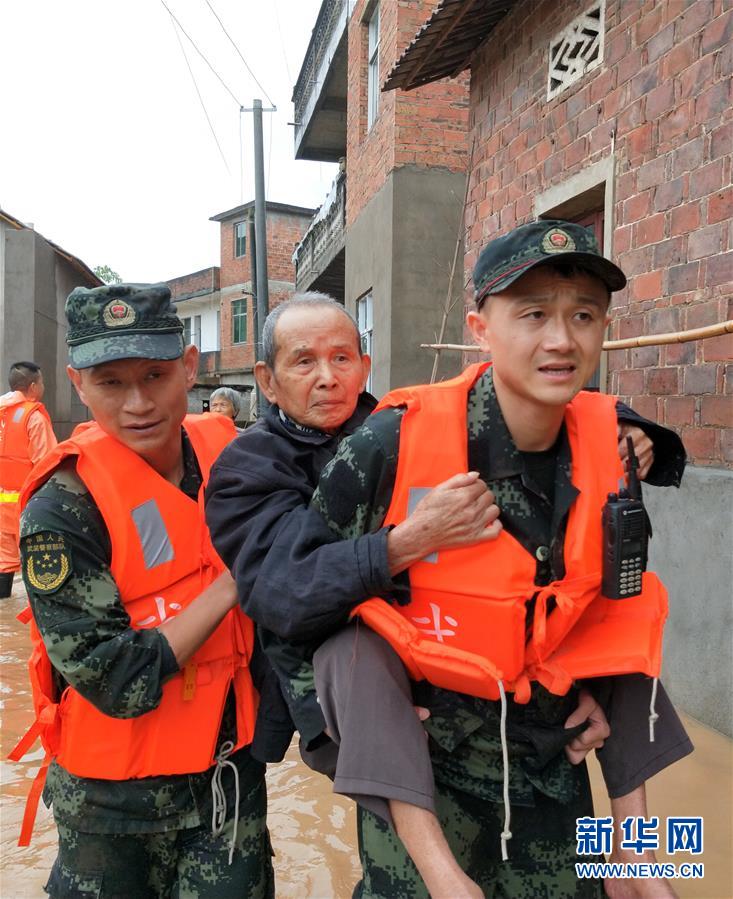 6月7日,武警江西省总队上饶支队官兵在玉山县下镇镇白桥村转移被洪水围困的老人。新华社发(吴展摄)