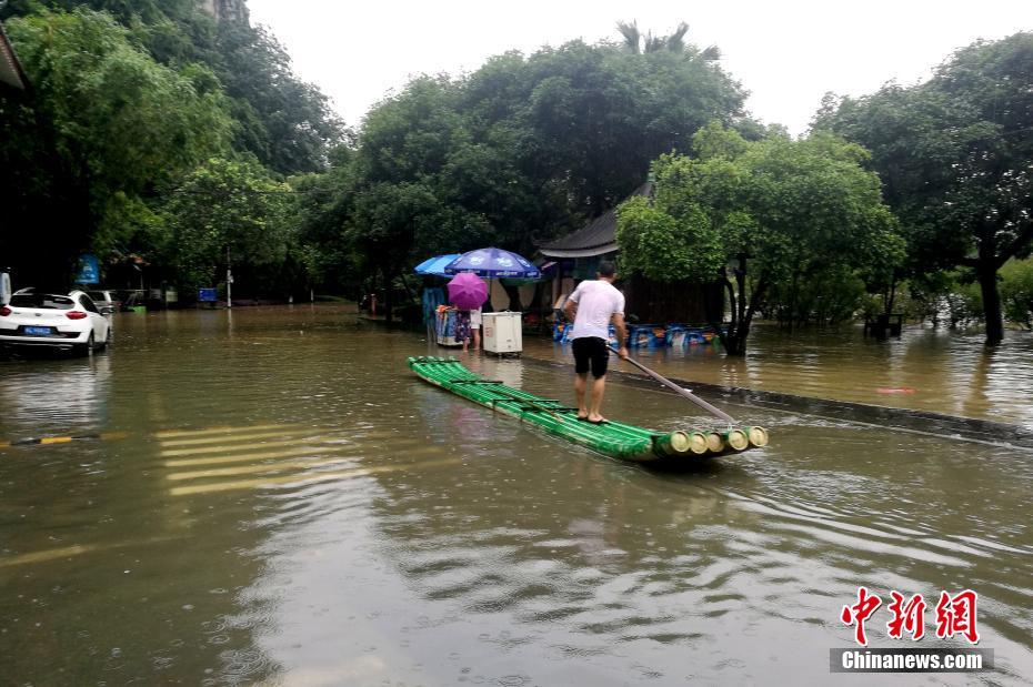 桂林穿山公园部分被淹,附近民众用竹笺出行。文/赵琳露 图/唐梦宪