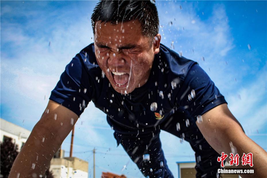 6月上旬,甘肃省森林消防总队平凉市支队开展“极限训练”。烈日下,消防员挥汗如雨,此次高难度大强度训练包括手翻百斤轮胎、综合体能竞技、单杠卷身上等科目,旨在提高森林消防员综合能力和磨砺血性韧劲。图为森林消防员在做俯卧撑时挥汗如雨。张广魁 摄