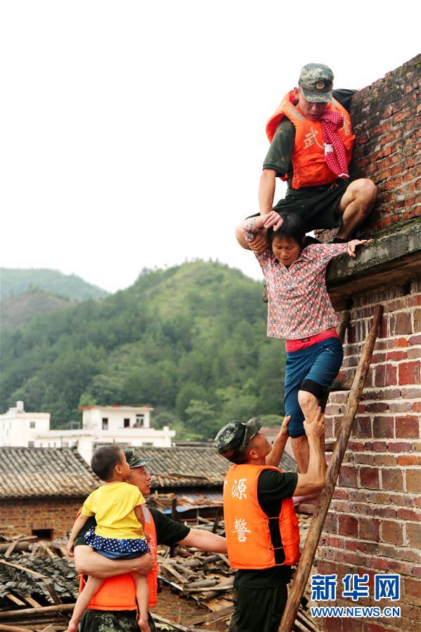 6月10日,武警河源支队官兵在河源连平县上坪镇转移被困群众。 强降雨导致广东河源市连平县、龙川县与和平县部分乡镇受灾严重。河源市政府通报,截至11日10时,已因灾死亡7人、失联1人,受伤3人。全市受灾人口11万余人,倒塌房屋956间。 广东省和河源市派出驻军、武警、公安、消防、民兵等救援力量1000余人在一线抢险救灾,电信、交通等部门正抢通被毁的通信设施和道路。 新华社发(廖键 摄)