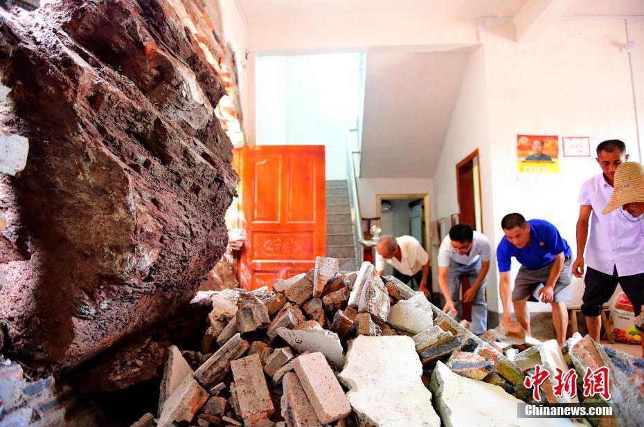 6月11日,受强降雨影响,江西省赣州市会昌县麻州镇大坪脑村,因滑坡导致山体松垮,几块巨石滚落而下砸穿一村民家中房屋,直接造成房屋墙面、承重柱和部分家具损毁,所幸人员撤离及时,未造成人员伤亡。事发后,当地组织人员及时上户处置,清理石块,便于搬离受灾点,事发地已拉起警戒线。中新社发 朱海鹏 摄