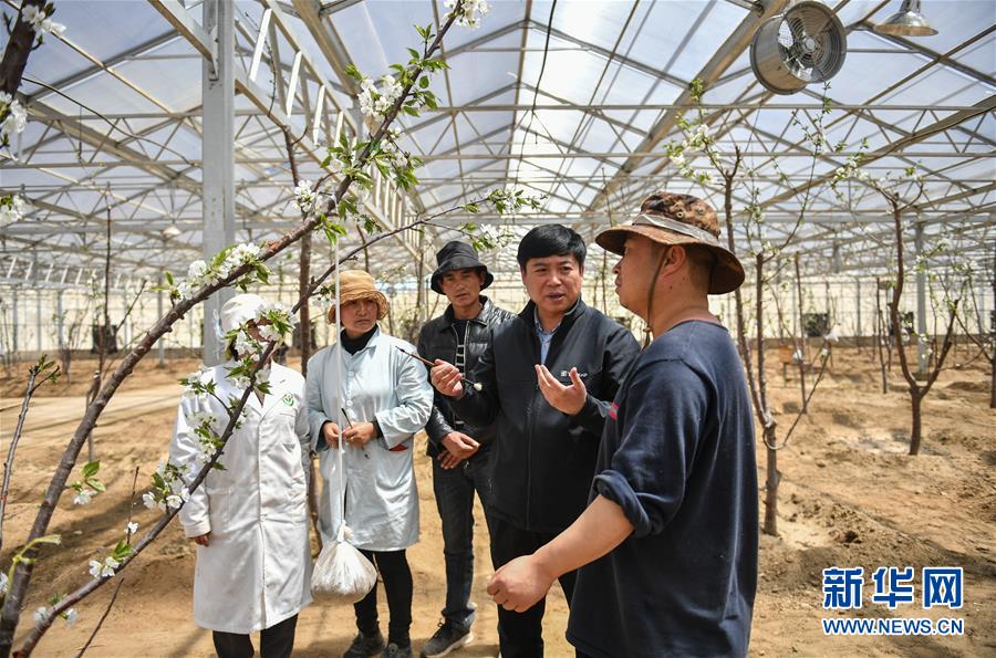 北京平谷区援藏干部赵金祥(右二)在援藏项目基地与工作人员交谈(4月19日摄)。新华社记者 晋美多吉 摄
