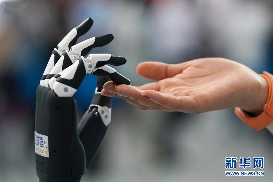 6月13日,一位参展商在演示展出的机器人产品。 新华社记者 鞠焕宗 摄