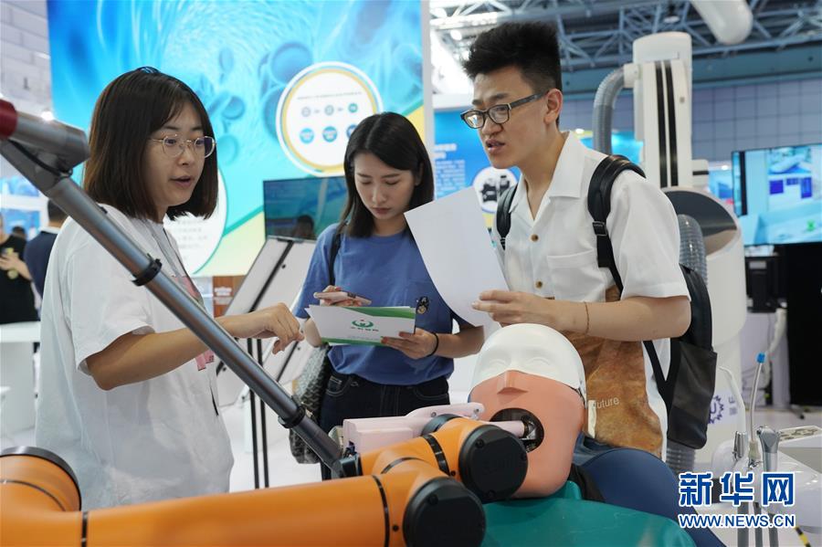 6月13日,几位参观者在参观展出的口腔临床微机器人手术系统。 新华社记者 鞠焕宗 摄