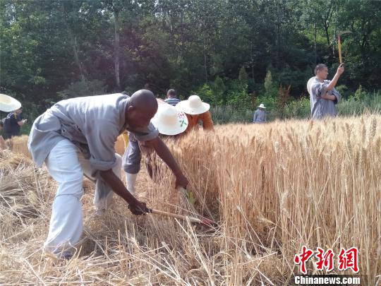 图为少林寺“洋弟子”割麦。 张海龙 摄