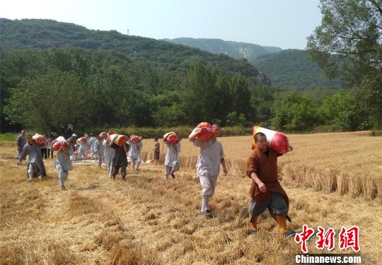 少林弟子们扛着收获的麦子穿过田间地头。 张海龙 摄