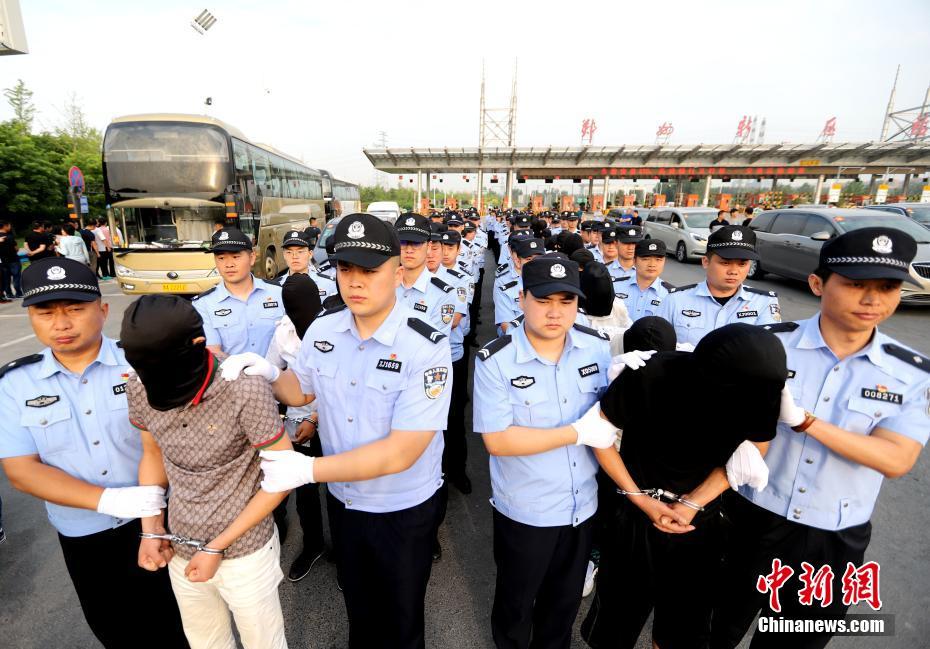 6月15日 ,河北郑州新区收费站,被押解的犯罪嫌疑人从河北保定抵郑,一个覆盖全国范围,以假借国家扶持、资金运作可获取千万利润的特大诈骗犯罪团伙被郑州警方一举摧毁,此案郑州方面出动警力和综治力量1000余人,共抓获诈骗犯罪嫌疑人61名,涉案金额近亿元。中新社记者 王中举 摄