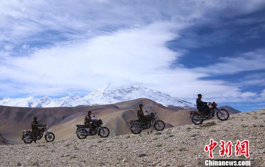 民警和护边员骑摩托车深入边境山口要道踏查。 吴明贤 摄