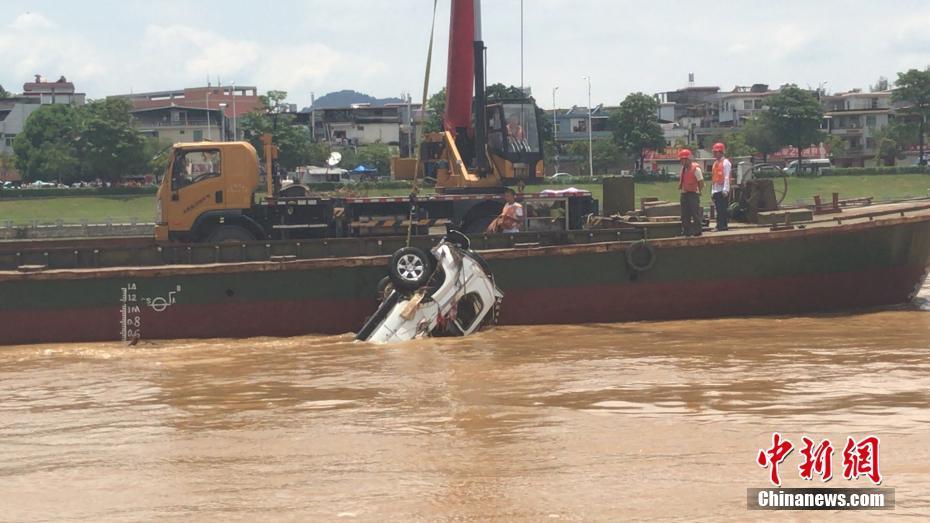 海事部门表示,接下来将继续组织搜救另一落水车辆,主要是核实摸排另一个高度疑似车辆位置点,位置位于垮塌的桥墩下游50米左右。图为东江大桥垮塌现场打捞起1辆落水车辆。陈德峰 摄