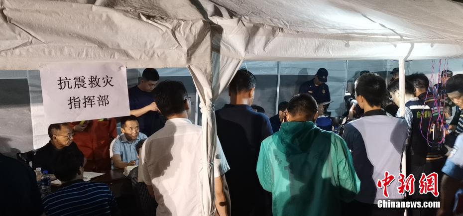 6月18日凌晨4时30分左右,经过4个多小时的长途行车,记者抵达了此次地震震中双河镇,至5时20分已先后经历了4次余震,最大震级4.5级。图为位于震中的抗震救灾前线指挥部正在开会。中新社记者 刘忠俊 摄