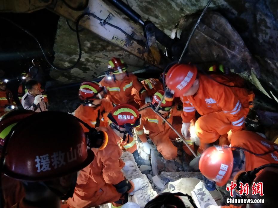 截至6月18日凌晨2时,四川省消防救援总队已调派宜宾、成都、自贡、泸州等地10个支队及总队全勤指挥部、总队战勤保障大队共116车、526人、4犬赶赴震中开展救援。图为宜宾长宁县双河镇葡萄村八组救援现场。文/中新社记者 刘忠俊 四川消防供图
