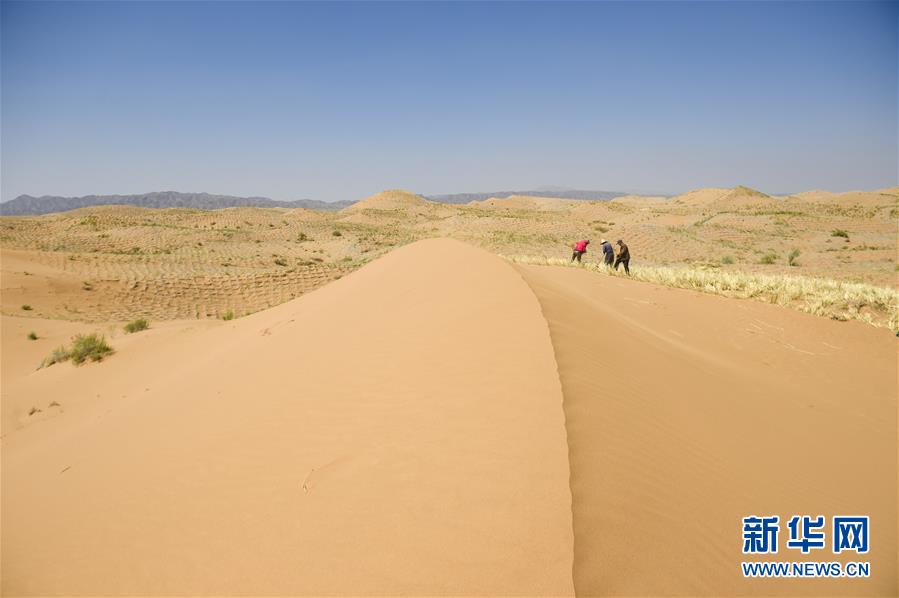 治沙工人在宁夏中卫市长流水沙区扎制草方格(6月13日摄)。新华社记者 冯开华 摄