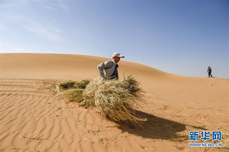 在宁夏中卫市长流水沙区,治沙工人在沙漠中搬运麦草(6月13日摄)。新华社记者 冯开华 摄