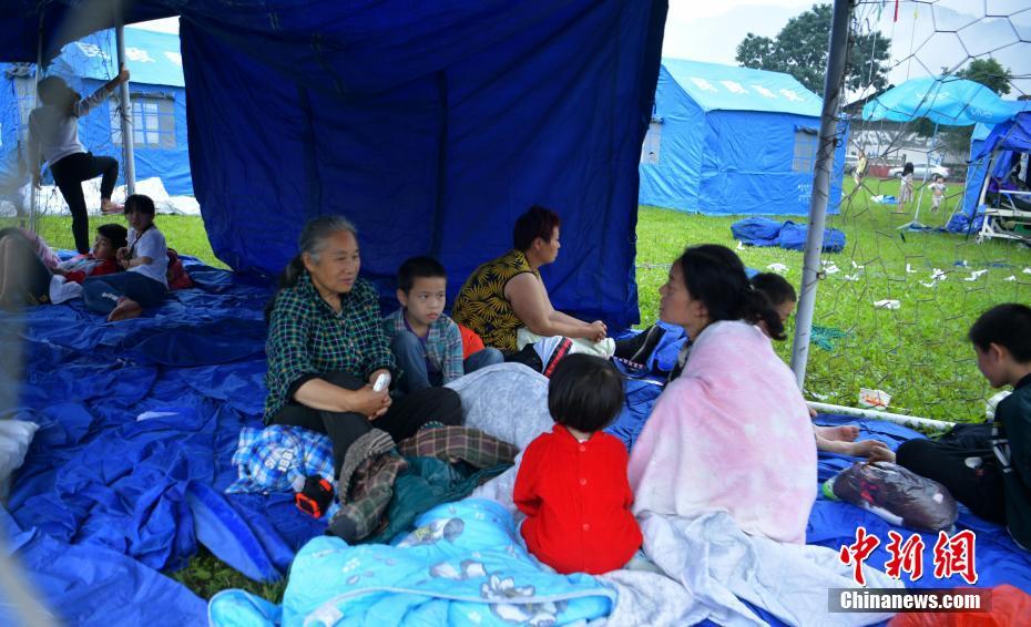 6月18日,四川宜宾,长宁县双河镇6.0级地震发生后,前期调拨的450顶帐篷、5300床棉被、1500张折叠床已陆续运抵灾区,民众转移安置等抗震救灾工作正在有序展开。6月17日22时55分,四川宜宾长宁县双河镇发生6.0级地震,震源深度16公里。图为震中双河镇中学操场上帐篷里的老人和孩子。中新社记者 刘忠俊 摄