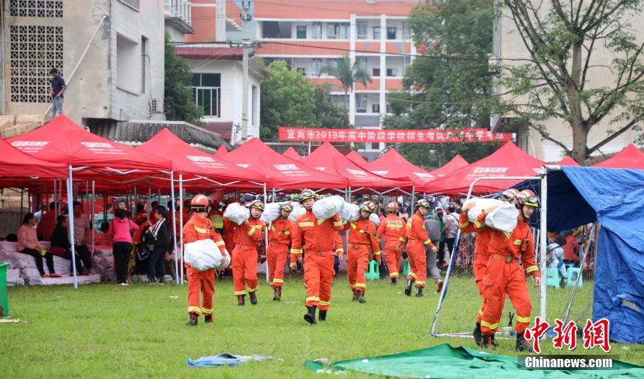 6月18日,四川长宁,双河镇临时安置点消防员协助搬运救灾物资。地震发生后,四川省、宜宾市前期调拨的450顶帐篷、5300床棉被、1500张折叠床等陆续运抵灾区,民众转移安置等抗震救灾工作有序展开。中新社记者 刘忠俊 摄