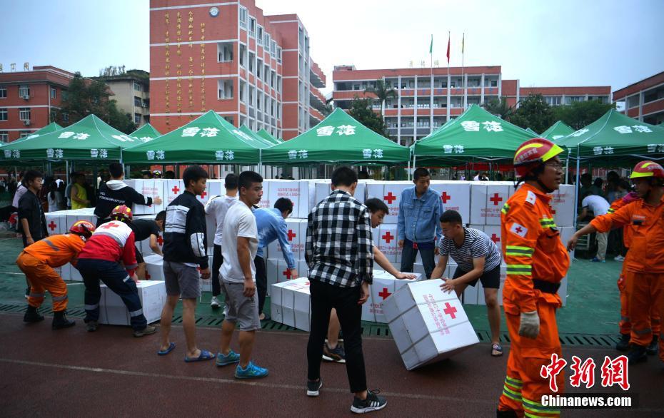 6月18日,四川长宁,双河镇一处临时安置点大批救灾物资运抵,志愿者正在搬运。地震发生后,四川省、宜宾市前期调拨的450顶帐篷、5300床棉被、1500张折叠床陆续运抵灾区,民众转移安置等抗震救灾工作有序展开。中新社记者 刘忠俊 摄