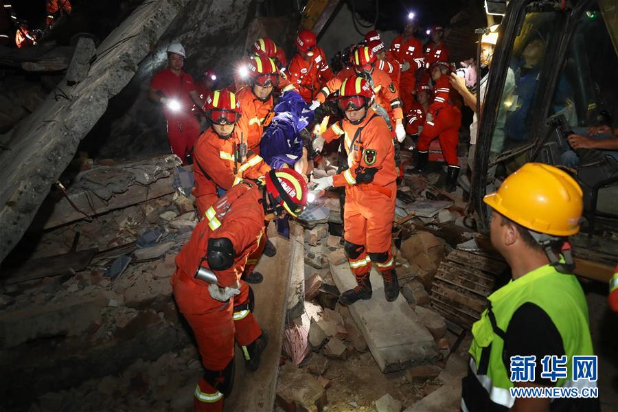 6月18日,救援人员在四川长宁县双河镇葡萄村一倒塌民房救援。 新华社发(庄歌尔摄)