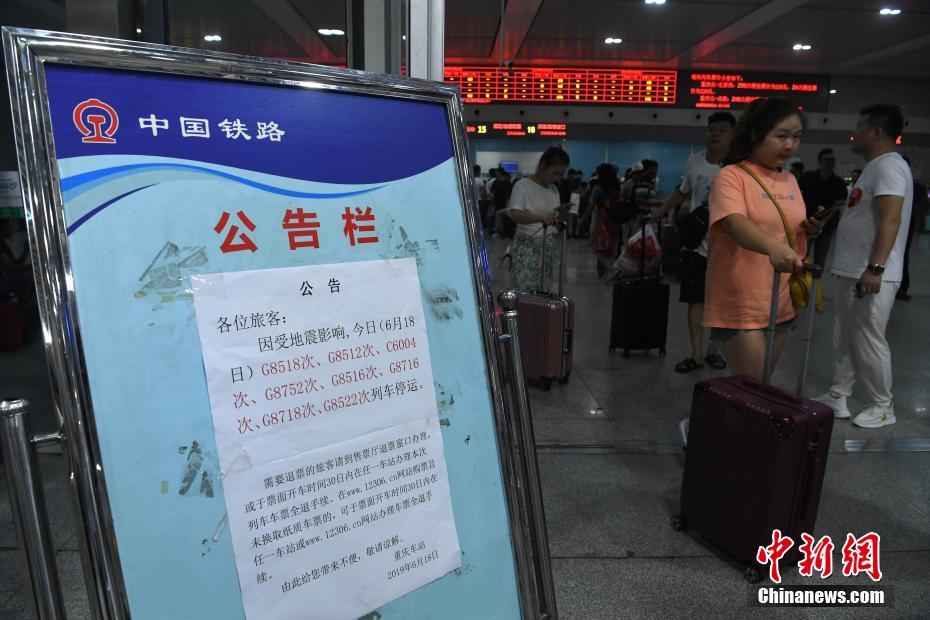 6月18日,受四川宜宾长宁县地震及余震影响,中国铁路成都局集团有限公司称,成渝高铁、渝贵铁路、成贵铁路、沪蓉铁路、沪昆高铁西段沿线及部分车站均有不同程度震感。据悉,截至18日10时,重庆火车站停运列车42趟、晚点18趟。重庆火车站已启动应急预案,全力以赴确保运输绝对安全。图为火车站内贴出列车停运公告。 中新社记者 陈超 摄